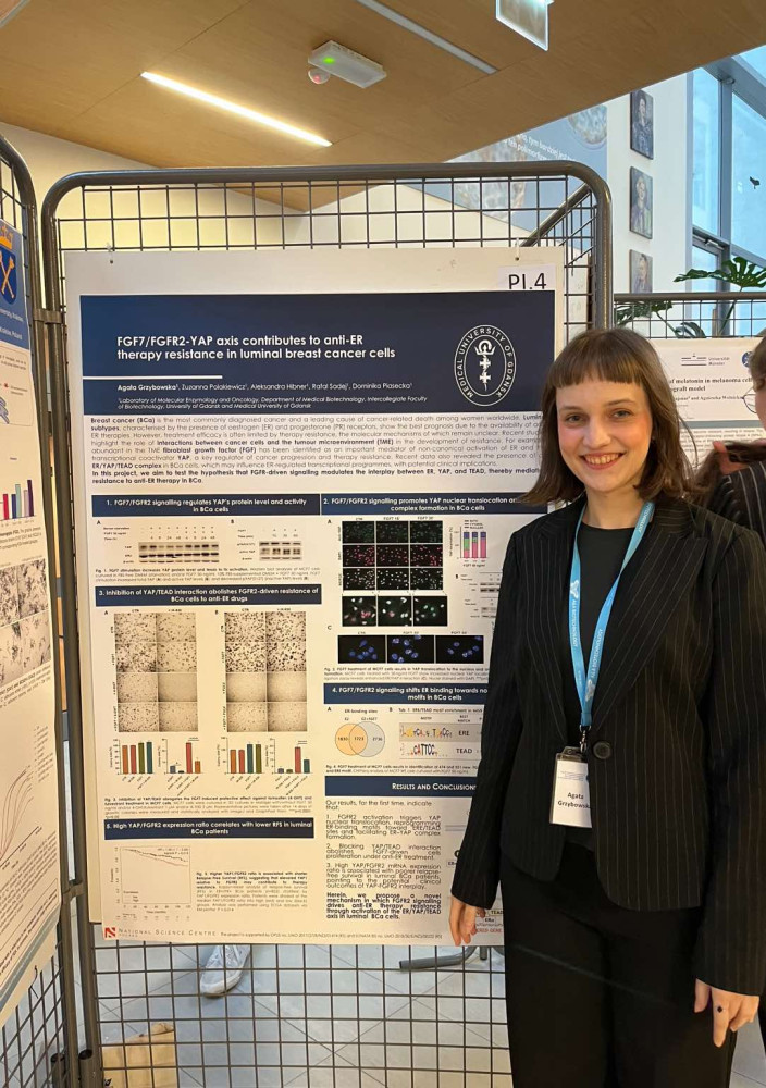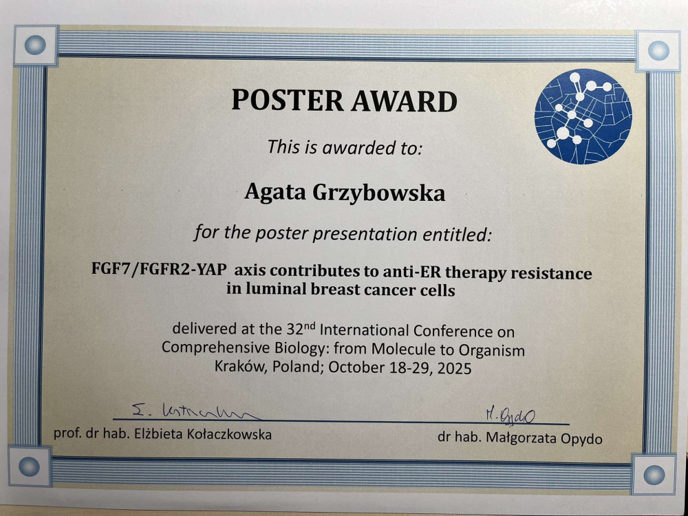 Z radością informujemy, że mgr Agata Grzybowska doktorantka z Zakładu Enzymologii i Onkologii Molekularnej została wyróżniona nagrodą za najlepszy poster podczas 32nd International Conference on Comprehensive Biology: from Molecule to Organism, która odbyła się w Krakowie w dniach 18-22 października 2025 r.